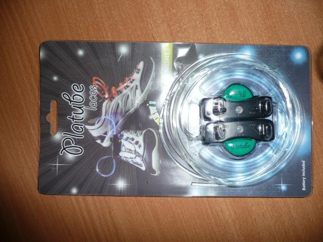 Nauji, nenaudoti, žaliai švičiantys LED batraiščiai.