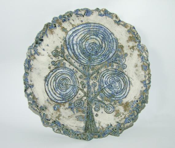 Rankų darbo vienetinė, dekoratyvinė lėkštė iš šamotinio molio pakabinama ant sienos. Skersmuo apie 26 cm.