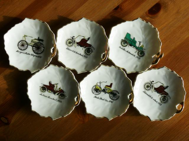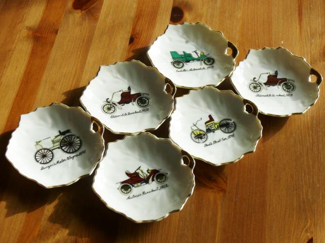 6 nedidukės dekoratyvinės lėkštutės su senoviniais automobiliais