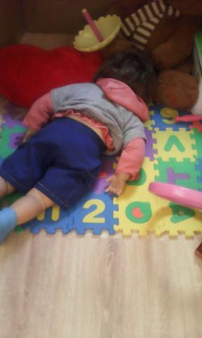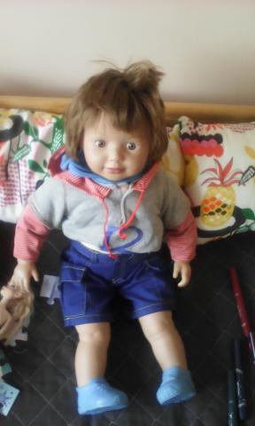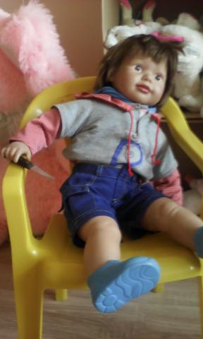 is kur atsirado nežinau, vieną rytą tiesiog radau sėdinčią prie lovos. miela ir draugiška, kartais man padeda nuskusti bulves- vienoje iš nuotraukų kaip tik ir matyti kaip ji ruošiasi tai daryti. puikiai tinkama išprašyti svečius is namų. nei už ką jos neatiduočiau, bet paskutiniu metu pradėjome nesutarti. jos aukštis 63 cm ir jau keleta metų nedidėja. Jei rimtas pirkėjas atsirastų pridėčiau vystymo lentą, nes kartais lėlės humoro nesuprantu ir tenka pasikeisti pampersą.