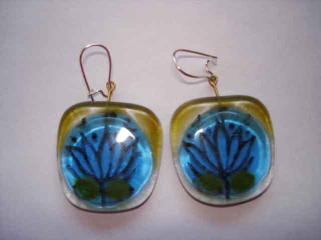 Stiklas, antialerginio metalo kabliukai, autoriniai piešiniai. Vitražinė technika.