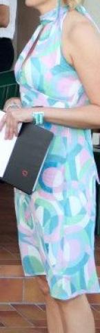 Miela, pasteliniu spalvu suknele siuvineta blizgiais zvyneliais.