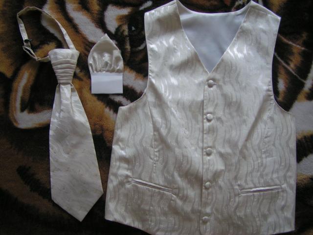 Taip pat parduodama jaunikio liemenė, kaklaskarė ir fantazija. Ant etiketės dydis 48. Nugaroje šiek tiek reguliuojasi dydis. Kaina 70 Lt.