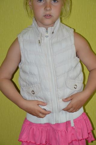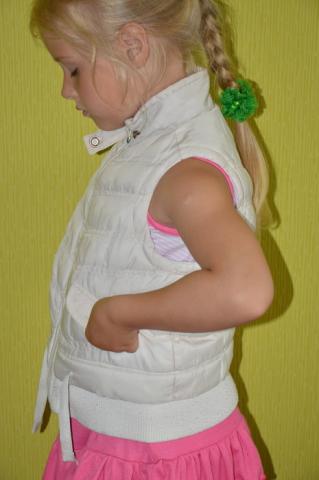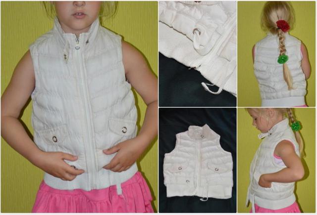 Visas liemenės ilgis ~43cm. Ilgis nuo pažasties ~26cm. Per krūtinę ~36cm (matuota po pažastimi). Rašo dydį: 4-5 metukų, 110 cm. Modeliukui 5 metukai ir 10 mėnesių. Defektukas: Užtraukiant reikia labai atsargiai užtrauktuko apačią prilaikyti.