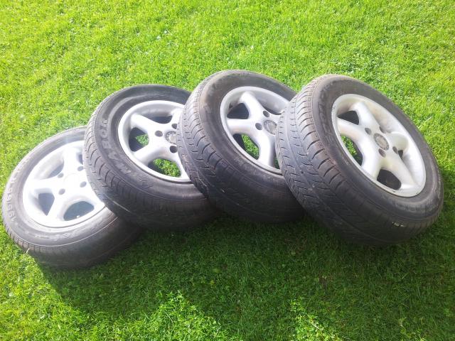 keturi r14 lieti ratais su padangomis, kurių likutis ~20%. ratai stovėjo ant kia clarus automobilio. išmatavimai: 4 x 114.3 (menamas žiedas, einantis per tvirtinimo skylių centrus), 67.0 centrinė skylė. diskai tvarkingi, nedaužyti. jei reiks- padangas numontuosiu. tinka: Mitsubishi Galant, Carisma, Colt (tik iki 92m), volvo v40