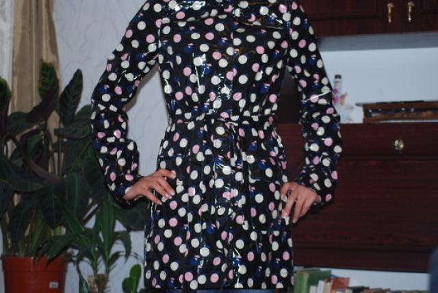 Dailus lietpaltis, su roziniais,melynais ir baltais taskeliais.