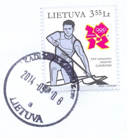 Lietuviškas XXX Olimpinės žaidynės Londone (2012m.) pašto ženklas su spaudu. Paveikslėlyje skenuotas variantas.