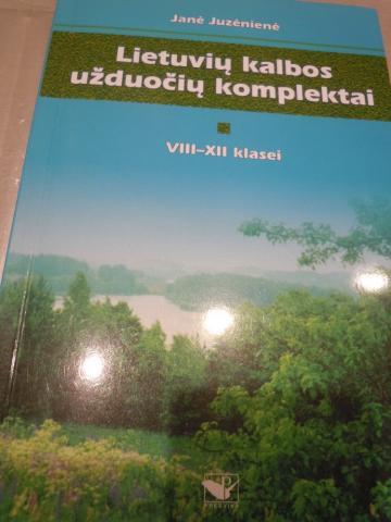 Janė Juzėnienė " Lietuvių kalbos užduočių komplektai " VIII-XII klasei 2003 m. 286 pusl .....Užduotys įvairios, parinktos atsižvelgaint į vidurinės mokyklos lietuvių kalbos programą: rašybos, skyrybos, žodžių darybos, gramatinio nagrinėjimo, pagrindinių ir išvestinių formų sudarymo, kirčiavimo, kalbos kultūros, stilistikos. Jas tinka aptarti per kartojimo ir įtvirtinimo pamokas, atlikti grupėmis ar individualiai, skirti kontroliniams darbams.