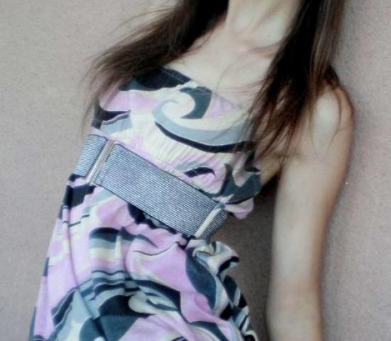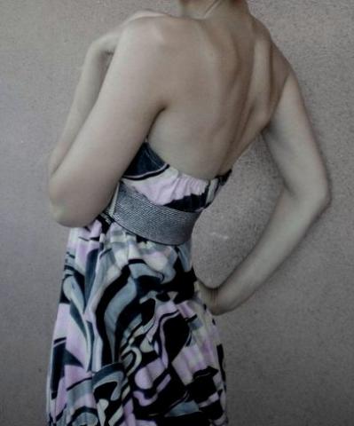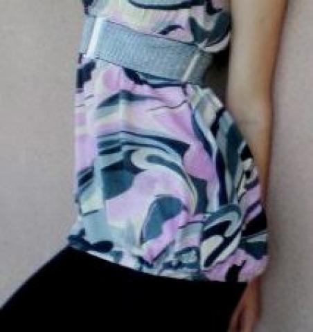 Atvira nugara, pūsta, raukta palaidinė.Po krūtine yra kilpelės diržui. Nuotraukoje pavaizduotas diržas nepridedamas. Kadangi tamposi, tinka dydžiams XS-M