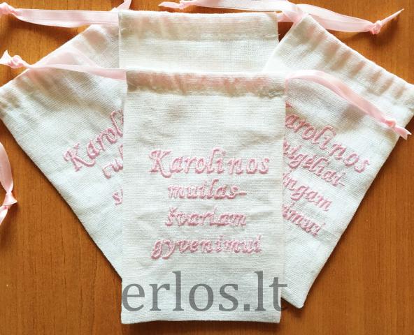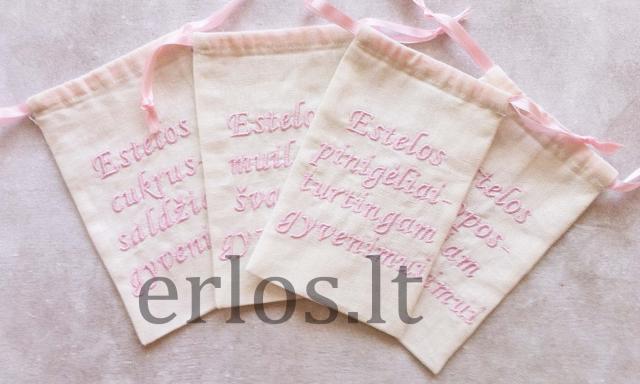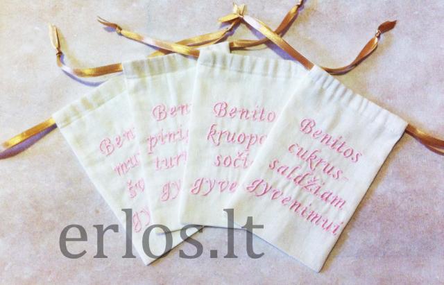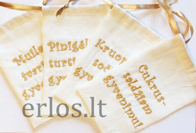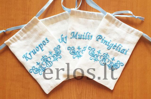 Lininiai siuvinėti maišelius simbolinėms krikšto dovanėlėms sudėti. Pagal tradicijas, šias dovanas krikštijamam vaikučiui įteikia krikšto mama. Maišeliai sukomplektuoti po 4 vnt. Kruopos - sočiam gyvenimui Cukrus - saldžiam gyvenimui Pinigėlis - turtingam gyvenimui Muilas - švariam gyvenimui Mūsų parduotuvė www.erlos.lt Daugiau darbų http://public.fotki.com/siuvinejumasina/