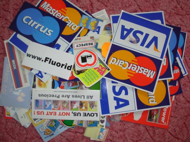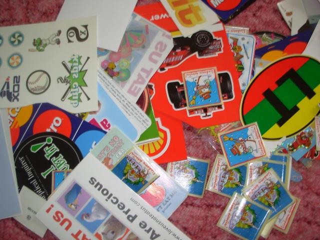 Labai daug įvairių lipdukų. Nuo mažučių mikės pukuotuko iki galingų master Card