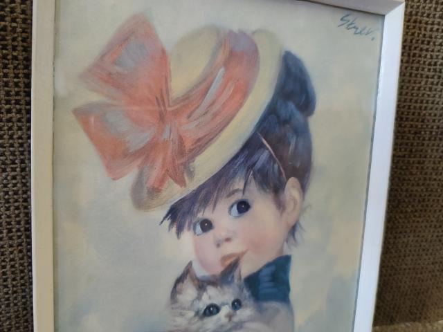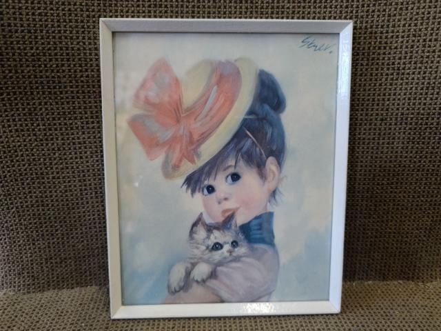Litografinis paveiksliukas mergaitė su kačiuku.