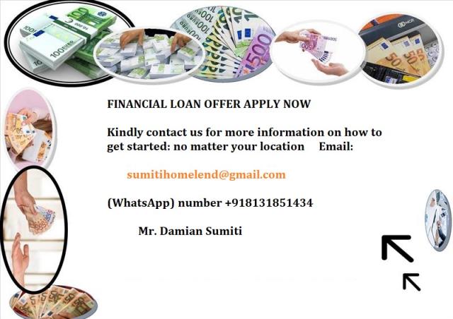 We offer all types of loans, and our offer is fast, safe and very reliable. profit from 2000 euros to 10 million. a good rate 2%. Kindly contact us for more information on how to get started: no matter your location sumitihomelend@gmail.com (WhatsApp) number +918131851434 Mr. Damian Sumiti