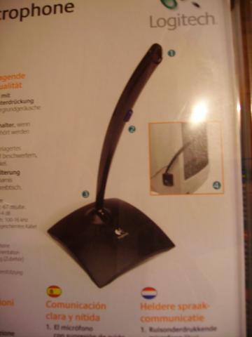 Logitech mikrofonas, naujas tik buvo išpakuotas pabandymui, veikia gerai, sertifikuotas skype pokalbiams. Statomas ant stalo, arba galima tvirtinti prie monitoriaus.