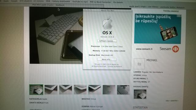 Specifikacijos: 2.4ghz Intel core 2 duo 4gb ram 500gb hdd. Geforce 8600m gt LED matinis ekranas. Baterija nesenai keista laiko apie 2.5val. Pridedu orginalu pakroveja. Irasyta naujausia os x 10.10. Turi pabraizymu, bet nebaisiai. Apacia pabraizyta labiau.