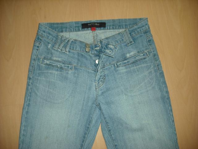 Madingai patrinti ir paplėšyti džinsai, padalkės nenunešiotos. Liemuo: 41; Klubai: 46cm; Nuo klyno i viršų: 21cm; Nuo klyno į apačią: 77cm.