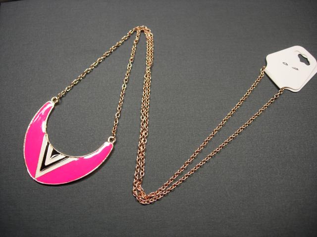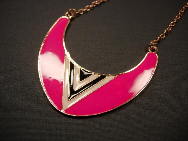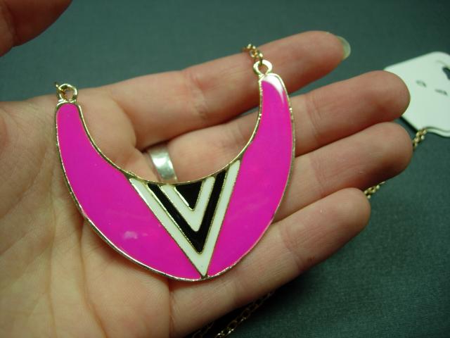 Patrauklus rausvas kaklo papuošalas su juodais ir baltais trikampiai ir aukso spalvos grandinėle. Papuošalo plotis: 5,7 cm. Ilgis: 37 cm x 2