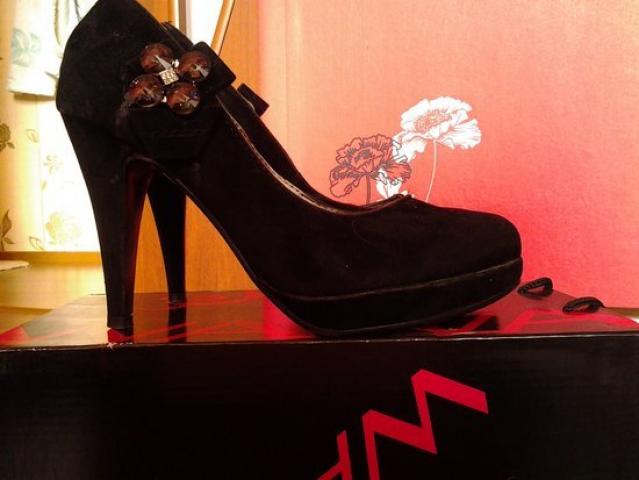 Juodi, zomšiniai su blizgančia gėlyte aukštakulniai. Patogūs. 38 išmera, pora kartų nešioti.