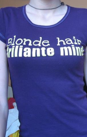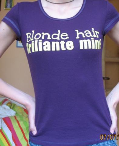 S dydis, spalva violetinė ;} Užrašas: Blonde hair Briliante mind