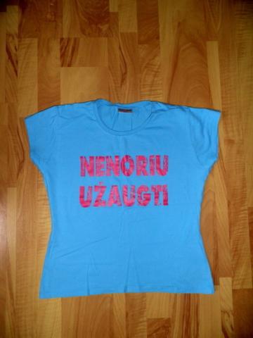 Draugė gimimo dienos proga padovanojo marškinėlius su užrašu "NENORIU UŽAUGTI". Tačiau pasimatavus, jie man gan mažoki. Dydis parašytas L, bet čia manau linkę arčiau M, o gal net ir S. Jie neištampyti, jų net nenešiojau. Užrašas nenusitrynęs, o spalva nenublukus.