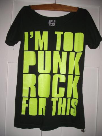 Tamsiai žalia maikutė, ryškiu užrašu, ne trumpa. Visai nedėvėta ir yra nauja. Parašytas dydis S, nors jis man labiau į L panašesnis. Kaina - iki 15 litų. Mane visada domina ir mainai.