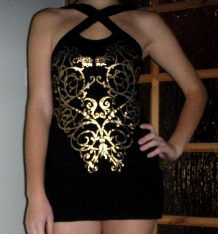 Juoda maikutė su aukso spalvos piešiniais. Galima nešioti ant tamprių. Galima derėtis.