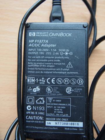Maitinimo adapteris HP F1377A. 19V, 2,4A. Tinka senesniems HP ir Compaq noutbukams, pvz., NX9010. Išsamesnė info čia: http://www.cheap-laptop-adapters.net/compaq/f1377a-ac-adapter.htm