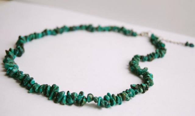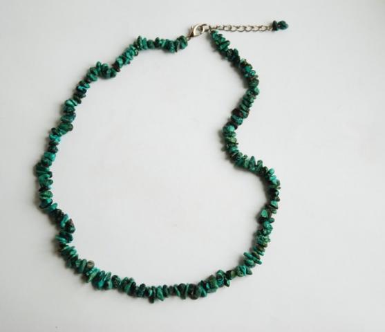 Malachito akmenėlių karoliai, nėra ilgi, sodriai žalios spalvos.