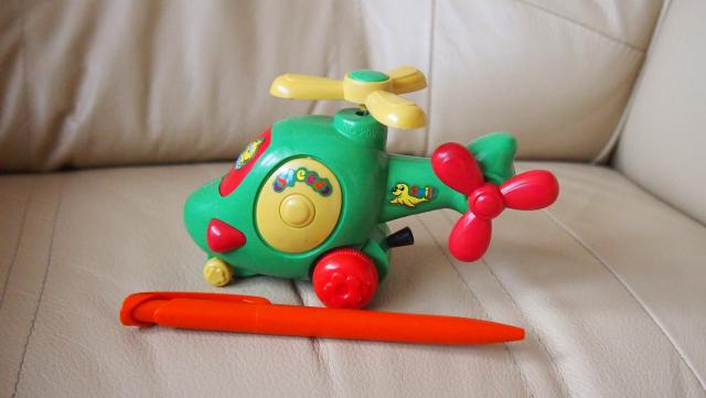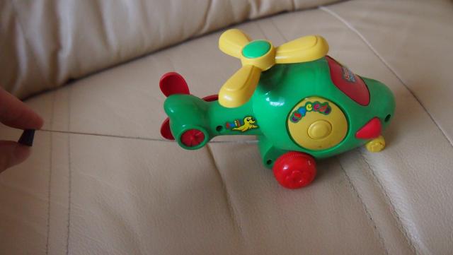 Patraukus už virvelės važiuoja, o viršuje sukasi sraigtas.
