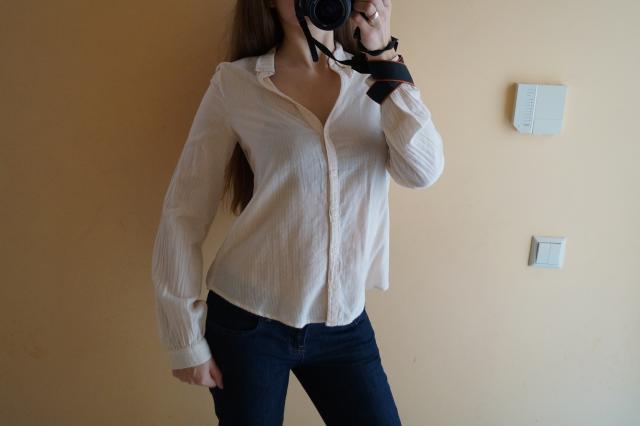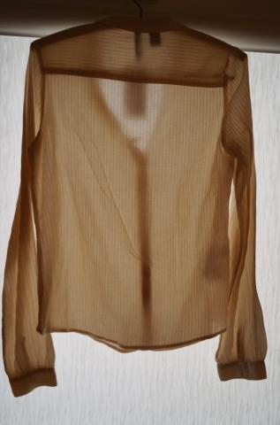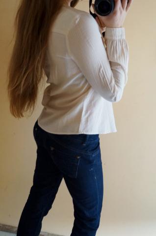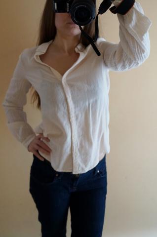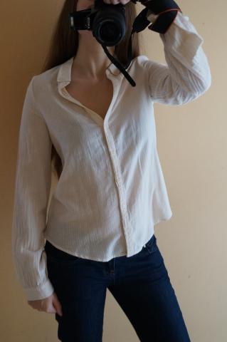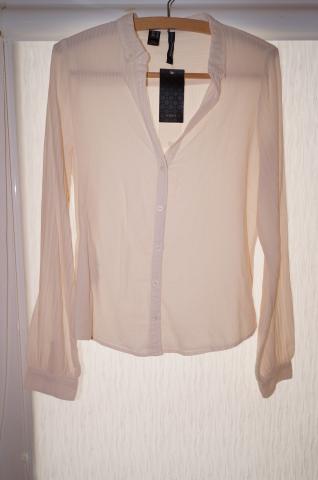 Gražūs medvilniniai pieno baltumo - švelniai smėliniai marškiniai. Yra pridėtos atsarginės sagutės. Dydį rašo M, bet labiau S/M. Ilgis 60 cm, tarp pažastų 46,5 cm, rankovės nuo pažasties ilgis 48 cm.