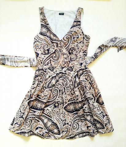 DYDIS: S/M; Vos porą kartų dėvėta. Puikiai tiks įvairioms progoms. Yra kišenės ( jų nesimato, tad jausitės ir puošni ir praktiška šypsena ). Taip pat šone - užtrauktukas. Suknelė turi pamušalą ir ilgas juostas iš šonų, kurias galima surišti į kaspiną ar kitaip formuoti. Medžiaga labai patogi, leidžia odai kvėpuoti, tad tikrai nebus per karštą.