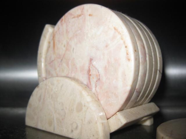 Gryno marmuro padekliukai po puodeliu ir stovelis jiems susideti.Is Turkijos.