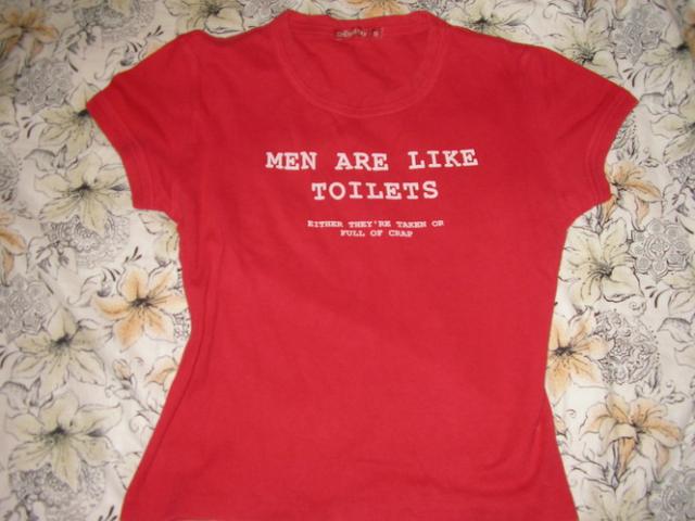 Dydis S. Užrašas: Men are like toilets: they are either taken, of full of crap.
