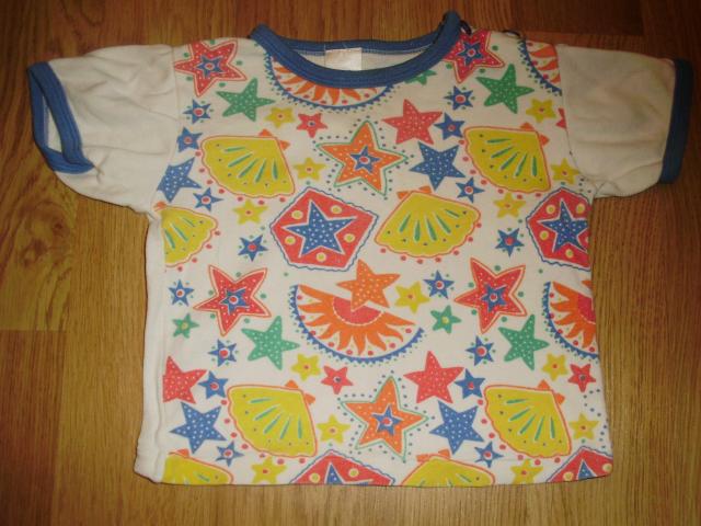 Panešioti, bet be defektų marškinėliai berniukui. Užsisega prie kaklo sagutėmis. Dydis 86 cm, tinka iki 18 mėn. Išmatavimai: plotis - 60 cm, ilgis - 31 cm.