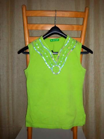 Ryškios salotinės spalvos marškinėliai su blizgančiais žvyneliais. Vieną kartą dėvėti, visiškai nauji. Mokėjau 30Lt. Labai tinka disco vakarėliui. Sudėtis: medvilnė