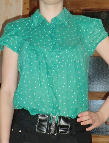 Gražūs žalios spalvos marškinėliai su baltais taškeliais. tinka ir prie kelnyčių ir prie sijonuko.