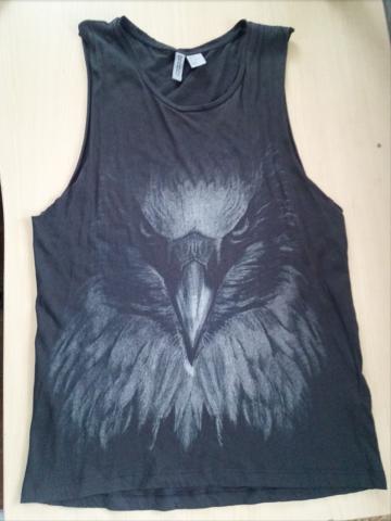 Juodi marškinėliai su ereliu, šonuose gilesnės iškirptės, dėvėti kelis kartus