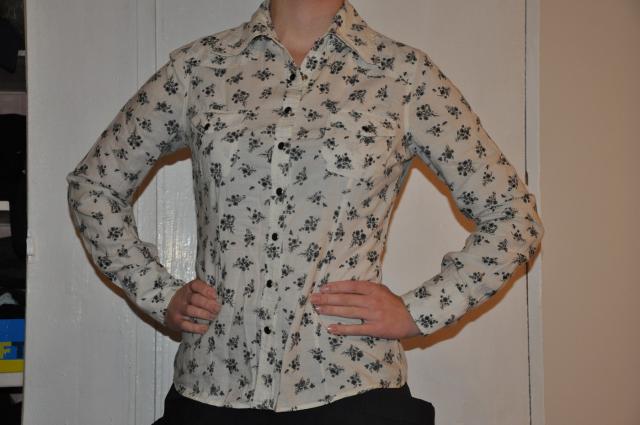 Gėlėti marškinukai. Antra nuo viršaus knopkutė neužsisega.