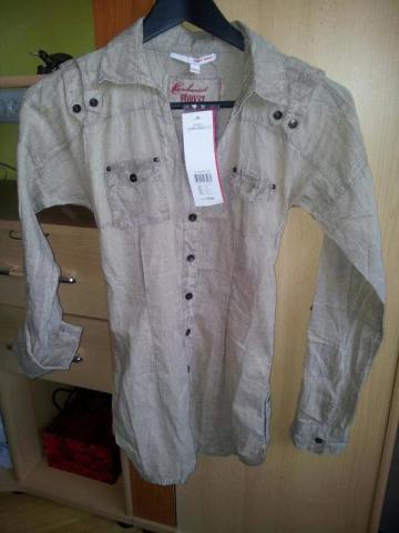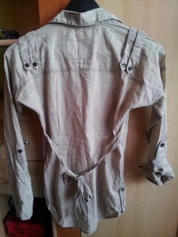 Nauji marškinukai parvešti bet šiek tiek mažoki man, tiktu ir S dydziui su nedidele krutine Rankovės atsilenkia-prisisega,nugaroj diržiukas,ties krutine gaunasi kad labiau apsitemptu-išryškėja krutine -žodžiu tom kurios nenori likt nepastebėtos pastebejau kad siek tiek prairusi kisene todel atiduodu uz maza kaina