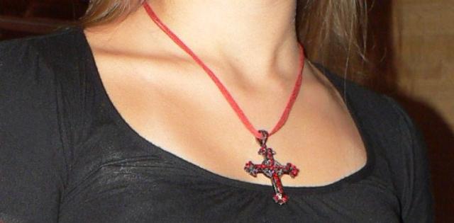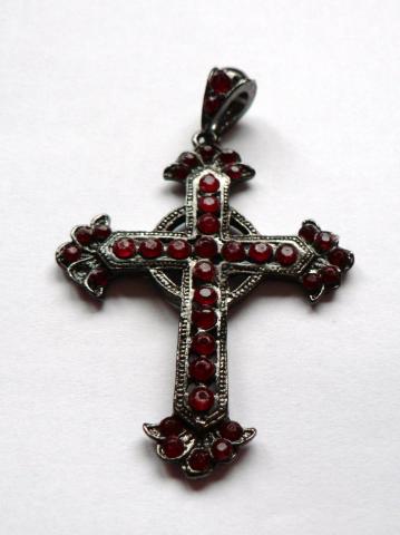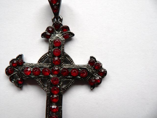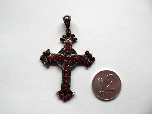 Vintage stiliaus, masyvus pakabukas - kryželis su raudonomis akutėmis. Vienos akutės trūksta, tačiau tai visai nekrenta į akis (nusipirkau jau be jos). Kryžiaus (be kilputės) ilgis - 5 cm.