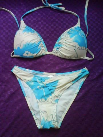 Nesiotas viena vasara, kadangi man jau mazokas, tai ir keiciu :) kelnaiciu dydis 38, o liemeneles dydis 42. Visai nenunesiotas, ten kur melynos juosteles, yra siek tiek blizgucio, bet nedaug, jis labai puosia maudymosi kostiumeli :)