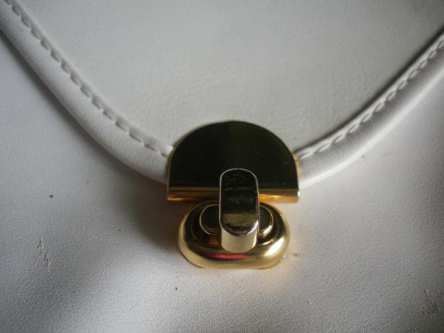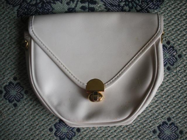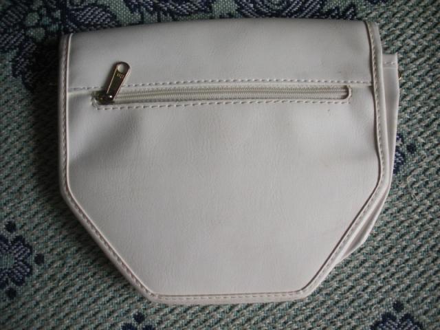 Balta maža rankinukė su galimybe prikabinti rankeną. Defektai matosi nuotraukoje, kiek apdraskyta oda kai kur. : )