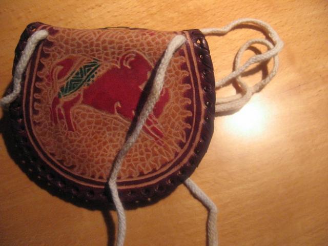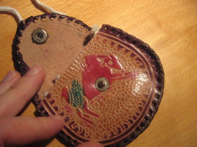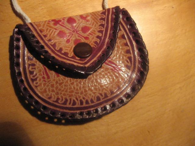 Nedidelė piniginytė. Natūralios odos, šiek tiek indėniška. Kraštelis tamsiai rudas.