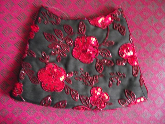 Labai mielas mažas rankinukas. Viena pusė papuošta raudonais karoliukais. Nutruko rankena (buvo padaryta iš juodų karoliukų, kai kuriuos surinkau ir turiu). Auksines rankas turinti mergaitė, manau, lengvai pataisytų šitą trūkumą. Mažai nešiotas, todėl visai tvarkingai atrodo.