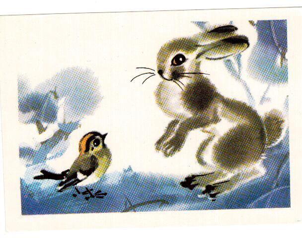 Mažo formato (maždaug pusės standartinio atviruko dydžio) atvirukas "Zuikis ir paukštelis" (1983 m.) Dailininkas V. Kanevskij.