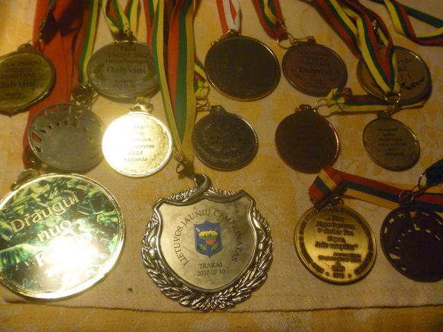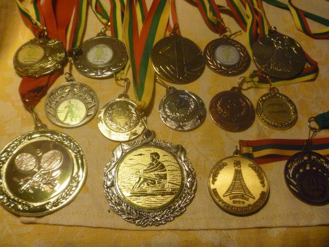 . sporto medaliu kolekcija 14vnt visi kartu 15e.atskirai dideli 2vnt baidares,tenisas po 3e,vidutinei po 2e auksiniai ir 1vietos,kiti po 1e. gairele su zenkliuku 1e.