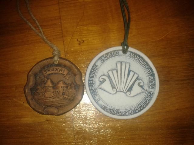 Medaliai. Viename pavaizduoti trakai, kitas iš muzikos konkurso.