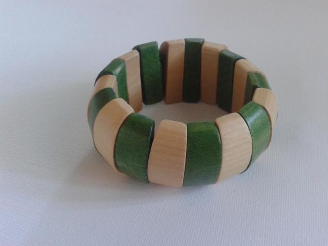 Medinė apyrankė ant gumos, žalios ir rusvos spalvos mediniais elementais