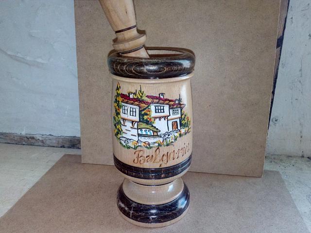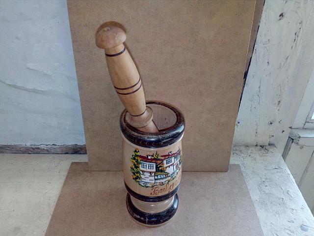 Indelio aukštis 13,5 cm. Grūstuvo ilgis 18,5 cm.