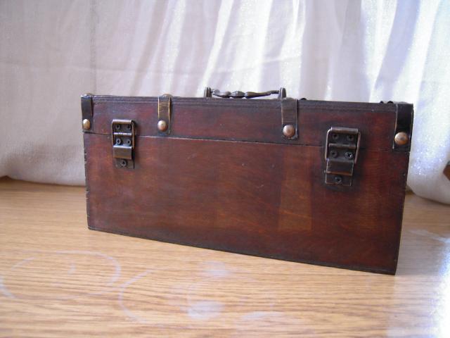 Rudos spalvos medinė dėžutė su metainėmis detalėmis, rankenėle, užsegimu papuošalams, mulkiems daiktams, kosmetikai susidėti. Dydis 13.5x11.5x25 cm. Siunčiu į kitus miestus.